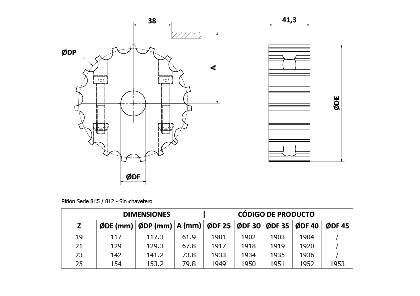 Pza. 1901 - Piñon Bip h Z19 D25 S/Chav MECANIZADO Cad. Recta inox.