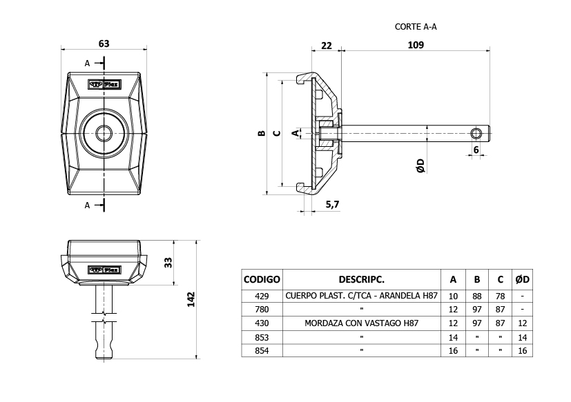 Mordaza = PAFG / Tuerca = AISI304 / Arandela =AISI304 / Vástago = AISI304