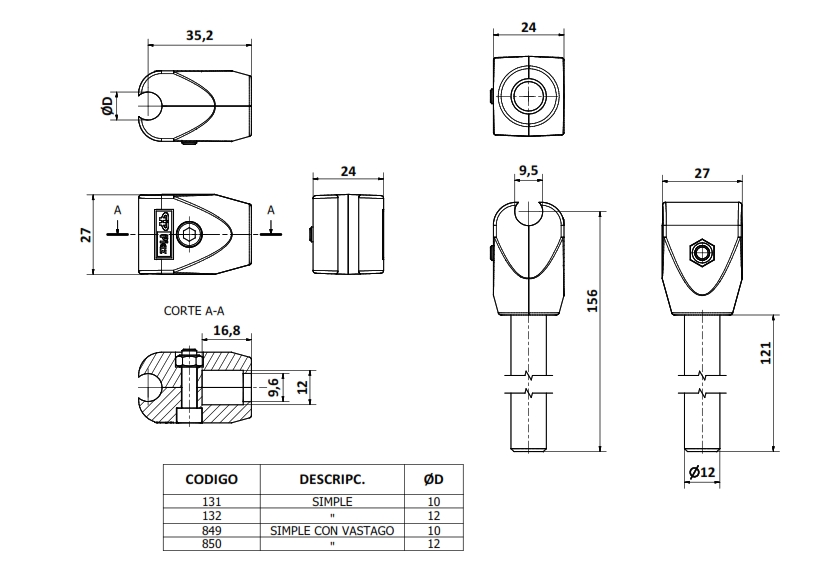 Pza. 850 - Mordaza Simple D12mm con vástago plástico 12 x L100
