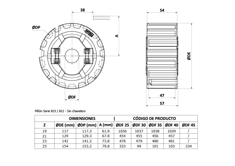 Pza. 334 - Piñon Bip h Z25 D45 S/Chav Cad. R.Inox.