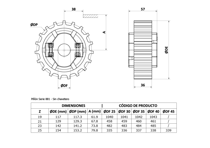 Pza. 339 - Piñon Bip h Z25 D45 S/Chav Cad. C.Inox
