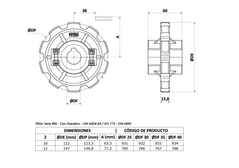 Pza. 938 - Piñón Bip h Z10 D40 C/Chav Cad. C.Acetal 880