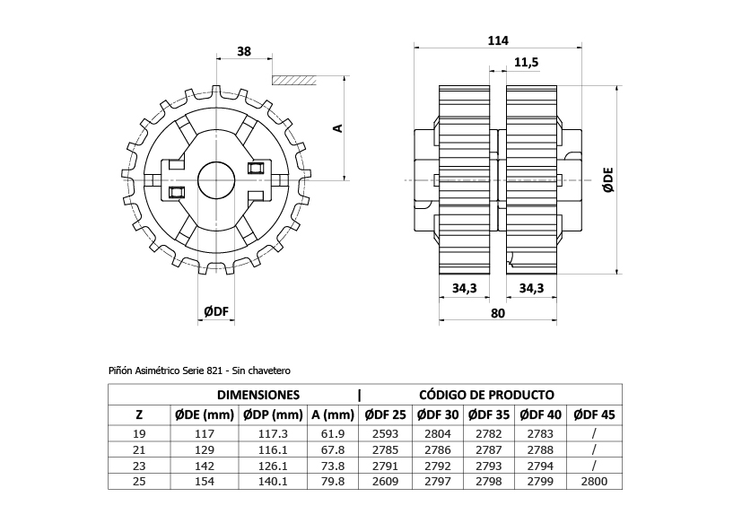 Pza. 2798 - Piñon Bip h Z25 D35 - S/Chav - Cad. Recta Acetal Asimétrico